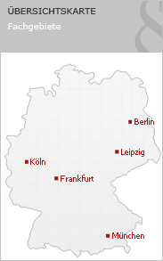Wählen Sie aus der Navigation rechts oder aus der Grafik auf der linken Seite den von Ihnen bevorzugten Standort aus. Dort finden Sie die Tätigkeitsschwerpunkte der Anwälte des jeweiligen Standorts
